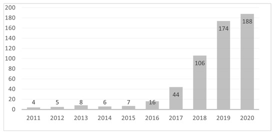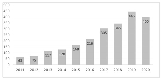 Using only one UAV for a specific mission may be risky because the UAV may encounter technical issues or other problems. In a reconfigurable or robust network of UAVs, if one UAV fails, the rest of the UAVs can still carry out the mission [5]. Generally, various tasks can be performed more efficiently by deploying a network of UAVs because they can collect more spatiotemporal data than a single UAV [6,7]. Moreover, networked UAVs allow system designers to equip different units in the network with different types of sensors, which in turn allows them to collect a wider range of data [8]. In addition, a flight formation using a combination of various types of UAVs of different sizes and configurations can be used to conduct complex tasks. As a type of sensor-based, communication-enabled autonomous system, networked surveillance UAVs can be considered a typical cyber-physical system. In recent years, networked UAVs have become one of the most important topics in UAV research [9]. In particular, a large and growing body of literature has investigated UAVs for surveillance and monitoring tasks and has presented a variety of technologies and methods. Performing a search using keywords such as “UAVs”, “Drones”, “Surveillance”, and “Monitoring” on the Web of Science Core Collection, we see that the research related to surveillance UAVs has increased rapidly since 2011, as indicated in Figure 2.
