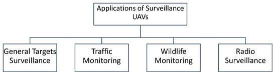We selected some representative publications and classified them according to the target of interest. Networked unmanned aerial vehicles are used in numerous applications, and this research area is growing quickly. It is impossible to cover all of these applications in a relatively short survey article. Therefore, we concentrated only on four very important application areas. Specifically, we present a review on the use of UAVs for general target surveillance, traffic monitoring, wildlife monitoring, and radio surveillance, as shown in Figure 3. We also present the related research gaps and future directions. These four selected categories encompass the practical applications of UAVs that have been widely studied [14,15].