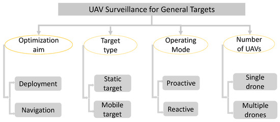 We can consider human beings and other objects in a certain area and even an area of interest to be general targets. The related approaches can be classified according to their optimization objective, target type, operating mode, and the number of UAVs; see Figure 4.