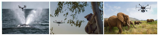 An increasing number of countries and organizations have adopted UAVs to conduct observations of wildlife in hard-to-reach places. From monitoring sandhill cranes in Colorado and counting waterbirds in Florida to investigating orangutan dens in Indonesia and seals in Arctic waters, UAVs fly at safe distances, protecting endangered wildlife and enabling environmentalists to work more safely, accurately, and economically. A summary of the existing publications on UAVs for wildlife monitoring can be seen in Table 1. The examples of wildlife-monitoring UAVs for protecting whales, koalas and elephants are as shown in Figure 6. We now introduce some of the representative works on UAVs for wildlife monitoring.