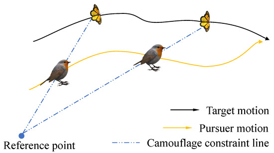 Basic mechanism of motion camouflage: When a pursuer approaches a moving prey, the former chooses its path so that it stays on a straight line segment connecting the current position of the target and a fixed reference point); see Figure 7.