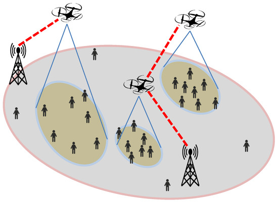 The deployment of unmanned aerial vehicles (UAVs) as UAV base stations (UAV-BSs) has been considered a feasible solution to surveil network users and to provide network coverage in scenarios where the conventional ground network is inaccessible or overloaded due to emergency events. Due to its mobility, fast deployment, and corporation, UAV-BSs can assist wireless communication networks in a variety of scenarios, such as serving users in severe shadow or interference conditions. For UAV-BSs, a fundamental research problem is its optimal deployment. An increasing number of publications have investigated the optimal deployment of UAV-BSs for improving network performance [20,101,102,103,104,105,106,107,108,109,110,111]. The search results from Web of Science Core Collection show that the research related to the deployment/placement of UAV-BSs has increased rapidly since 2015, as indicated in Figure 8. An example of UAV-BSs’ application scenario can be seen in Figure 9. We now present a brief review of some representative work on this topic.