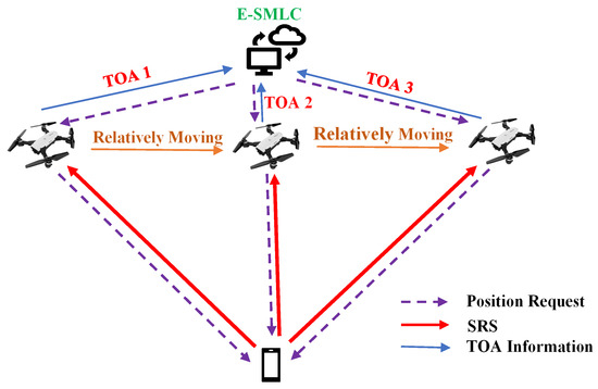 An illustration of the signal transmission process of the proposed UTDOA using a flying UAV-BS can be seen in Figure 11.