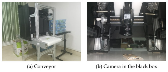 A simple visual recognition system for on-conveyor objects is illustrated in Figure 1. Serial images are captured by an RGB industrial camera mounted above the conveyor. The frame rate is about 30 fps, and the speed of the conveyor is about 10 cm/s.