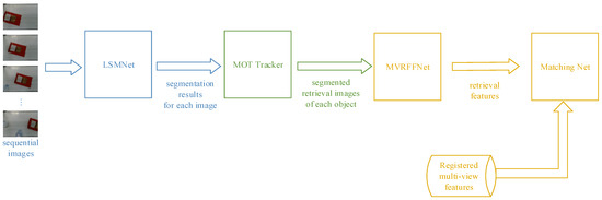 The overall architecture of the proposed method is depicted in Figure 2. It consists of three main modules: LSMNet, MOT tracker, and MVRFFNet. LSMNet generates instance segmentation results for the MOT tracker, and the tracker provides segmented retrieval images for the MVRFFNet. We can choose several frames for an object to improve its retrieval accuracy. In the inferring process, a matching network is used to retrieve the redundancy-free features of the on-conveyor objects from the gallery of registered multiview features. Other metric learning methods, for instance, the cosine or Euclid distance, can be used to replace the matching network. When some new objects occur, we only need to register their multiview features without any additional work.