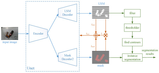 The framework of LSMNet is depicted in Figure 4. In the training process, the LSM loss and mask loss, together with a consistent constraint loss, were calculated and used to update the backbone. In the inferring process, small noisy regions of were filtered first, and the foreground regions were segmented with a threshold > 0.5. Each region corresponds to an instance, and the instance regions are dilated in a ratio proportional to its area.