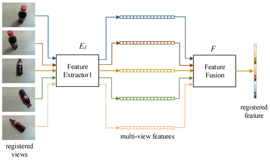 Denote the registering view set of objects as , the seen conveyor view set as , and the unseen conveyor view set as , where is the number of views, and satisfies . In the registering module, features of different views are extracted separately with a feature extractor first; that is . are fused to a registered feature with a fusing network ; that is . could be a simple max-pooling layer [2] or a recurrent neural network (RNN) [1] that evolves along with the variation of view. A graphic neural network (GNN) is also a qualified candidate fuser. is trained separately, and is trained together with the mapping module. The architecture is depicted in Figure 5.