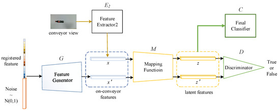 In the mapping module, the redundancy-free feature mapping framework [3] is adopted. The structure is depicted in Figure 6. The generator , with the concatenation of a registered feature and a noise vector as its input, generates a synthetic or fake on-conveyor feature. The noise represents the properties of difference between the registered and on-conveyor features, which includes environment light, background noise, the motion of the camera, and multiview modal to single-view modal. The mapping function maps the on-conveyor features into a latent space, which is the redundancy-free feature space. is the discriminator that is realized in the form of Wasserstein distance. Wasserstein distance is a symmetrical measurement for the difference between two random distributions. is a feature extractor to obtain features from on-conveyor images, and is a final classifier to predict the categories of latent features.