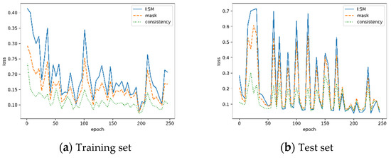 In this experiment, we used a fully convolutional UNet with skipping connection as the basic architecture of LSMNet. The learning rate was set as 0.0002, the batch size was 6, and the weights were . Cropping, rotation, channel fusion, and color jitter were used to augment the dataset. The curves of the training loss are illustrated in Figure 9. The curves are above that of , as LSMs are more difficult for the pix2pix network to learn than binary masks. The fluctuations of , , and are almost synchronous, and it means that the consistent constraint is violated more seriously when the predicted LSM and mask are poor. The fluctuations would be eliminated if a bigger training set is accessible. Because the objects in the test set were new for the model, the loss of the test set was unsurprisingly much larger than that of the training set. In Figure 10, a few samples of the predicted LSMs on the training set are shown. LSM output suffers from small noisy regions (Samples 1, 3, and 5), which are filtered in the consistency outputs. However, some tiny objects are missed. The performance of LSMNet on small objects would be discussed further in the experiment on the COCO-car dataset.