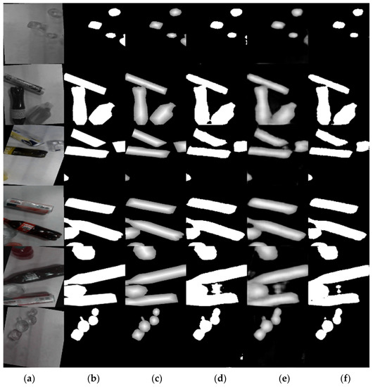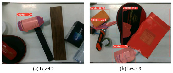 The distribution of the OCIS dataset is listed in Table 1. The objects in the test set are different from those in the training set. Some groups of samples are depicted in Figure 7 and Figure 8. In addition, we collected 15 video clips of different levels of difficulty. Level 1 means that there is a distance between any two objects, Level 2 means that objects flock without any occlusion, and Level 3 means that there exist overlaps among objects. Due to the smooth surface of the conveyor, the reflection of illumination causes conspicuous noise.