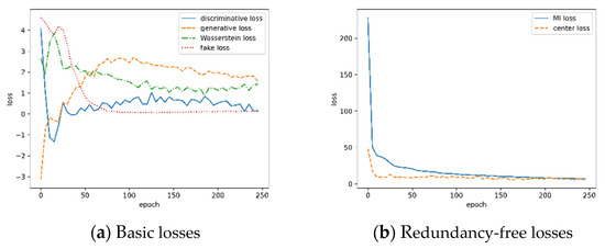 Besides the usual fake loss and Wasserstein distance in WGAN, the mutual information (MI) loss based on Kullback–Leibler divergence and the center loss [3] are also considered when training and .
