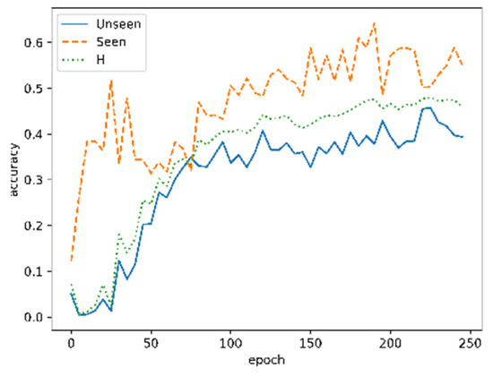 With the same setting as [3], we trained MVRFFNet with four different fusing models. The results are listed in Table 6. The performance of RNN was close to GNN and better than a simple max-pooling or average-pooling layer. The training process is depicted in Figure 14 and Figure 15. As seen classes can provide direct information for classification, the accuracy of seen classes achieves 0.3 in the first 10 epochs. The seen and unseen classes achieve a balance after 60 epochs and keep stable after 200 epochs. MI loss descends rapidly in the first several epochs and then smoothly till the end of the training process, while center loss descends rapidly in the first several epochs and keeps stable in the following epochs. This is because center loss constrains the inner-class distance of redundancy-free features on themselves, while MI loss composes an upper bound on the conveyed information between the original and redundancy-free features.