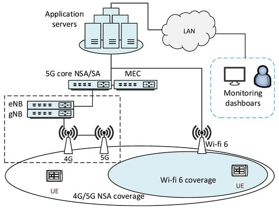 Test were made at 5G and Beyond Test Network, operated by VTT Technical Research Centre of Finland, which offers tens of different types of standard radio access nodes including latest 5G NR as well as Wi-Fi and cellular IoT technologies complemented with non-terrestrial satellite connections. The test network consists of several private 5G sites with full-scale end-to-end (E2E) data communication system supporting 5G standalone (SA) and non-standalone (NSA) architectures. For dedicated measurements, it is possible to isolate part of the test network resources and equipment to be utilized in dedicated tests and development projects, similarly to how it was done also with the study presented in this paper. Figure 1 shows the architecture that was used in this study. The figure illustrates the network setup, which consists of non-standalone 4G (evolved node B, eNB) and 5G NR (next-generation node B, gNB) base stations as well Wi-Fi 6 access points providing the radio coverage. Wi-Fi network coverage was not integrated to the 3GPP 5G architecture; instead, it was a dedicated test setup utilizing the same backbone network as the 5G core and multi-access edge computing (MEC) servers. In the 5G core network, backbone 5G core network instances together with MEC support were used. The MEC application server was realized by following the ETSI specified distributed EPC architecture specification [].