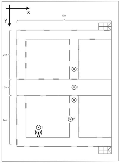 The measurements were made by anchoring each base station in turn to the other end of the office building and performing throughput and delay measurements at the specified measurement points. The Figure 2 shows the location of the base station and measurement points in the floor plan of the office building.