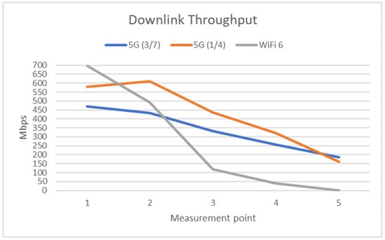 This section presents and compares the measurement results obtained with 5G and Wi-Fi 6 base stations. Table 3 presents all the measured values in all the measurement points illustrated in Figure 2. Throughput values are given as peak values and delay as an average value. Figure 3 and Figure 4 compare the measured downlink and uplink throughputs between 5G and Wi-Fi, and Figure 5 compares delay. For 5G, values for both 1/4 and 3/7 DL/UL ratios are shown, which correspond the Frame Structure Type (FST) for allocating bandwidth to DL and UL.