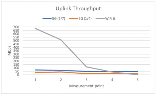 Looking at Figure 3 and Figure 4, it can be seen that Wi-Fi 6 outperforms 5G throughput both in uplink and downlink when the distance from the user equipment to the base station is really short, but the situation changes rapidly as the distance to the base station increases. Similarly, the throughput measured with the 5G remains higher than with Wi-Fi 6 if there are signal blocking barriers between the user equipment and the base station, such as closed doors or walls. This is easily seen when comparing measurement points 3 and 4, which are located very close to each other but with a closed door between them. The results show that 5G achieved the best downlink throughput using frame structure type 1/4, but the best uplink throughput was measured using frame structure type 3/7.