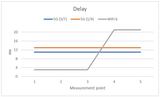 The delay comparison shown in Figure 5 follows a similar trend as can be seen in the case of throughput measurements. Wi-Fi 6 is clearly ahead of 5G at close range, but as the distance increases, the delay of Wi-Fi 6 collapses while at 5G it remains stable. The collapse of the Wi-Fi 6 delay when moving from the measuring point 3 to the measuring point 4 is due to the fact that there is a closed door between those points, which clearly effectively blocks the communication between the Wi-Fi 6 base station and the user equipment.