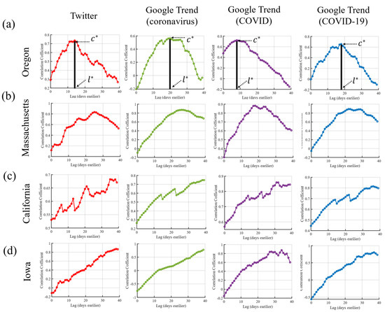 Illustrations of the lagged correlations between new confirmed COVID-19 infections and data from Google Trends and Twitter in the selected 4 states: (a) Oregon, (b) Massachusetts, (c) California (d) Iowa.