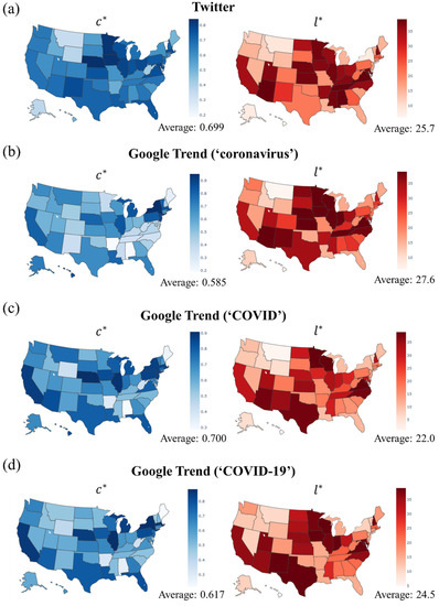 In the earlier related research, it has been illustrated that data from online social media and Internet searches are correlated with several epidemics that have previously happened, such as seasonal influenza epidemics [7], Dengue [8], MERS [9] and H1N1 [10]. Regarding COVID-19, several works [11,12,13,14] have demonstrated a significant correlation between the Internet search and the pandemic spreading among different countries. For instance, a Google Trends comparison with the number of infections in various countries was presented in [11], where it was found that initially the correlation between searches and infection rates in these countries was high with a lag of 0 to 12 days but decreased while the infection rate was still going up once the initial public interest in COVID-19 was tampering off. In [12], the authors compared the social media posts and search trends in China with the infection rate, albeit only until 11 February 2020. Although a correlation was found, its representativity is limited, as the period of the analysis was very short and restricted to China. Study [13] finds for 21 countries, the more citizens of a country search for “hand washing,” the lower is the infection rate. However, this is also a very short study, only covering the period from 19 January to 18 February 2020, and thus of restricted generalizability. In [14], it was found that searching for “loss of smell” from 1 December 2019 to 25 March 2020 in Italy, Spain, UK, U.S., Germany, France, Iran and the Netherlands directly correlated with the infection rate in these countries. While these studies demonstrate the initial predictive power of search trends and social media posting for predicting the infection rate, they are all restricted by the relatively short observation period during the onset of the pandemic, as well as the limited comparability of the observed geographies. Therefore, it still remains unclear what regional factors the Internet’s predictive abilities may relate to and whether they are useful at surveilling the spread of the disease. Our hypothesis is that there will be a statistically significant correlation in the Google search and tweeting behavior of a U.S. polity such as a state or a city and its COVID-19 infection rate, which thus will give valuable input to policymakers, governments, and healthcare providers to better prepare and deal with potential future waves of the COVID-19 and other epidemics.