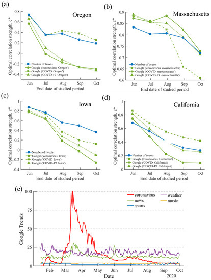 As the COVID-19 pandemic has been going on for many months, a lot has happened and changed. It is thus necessary to study the dynamic of the correlation between search and tweeting behavior and COVID-19 infections across time with extended data. Specifically, we further collected the state-level daily infection numbers, the COVID-keyword searches in Google Trends and the number of tweets in Twitter up until 30 September 2020. We find that the relationship between the COVID-19 pandemic spreading and the Internet data in all 50 U.S. states becomes weaker, especially in the last few months (see illustrations of four states in SI Figure S4). To further confirm the correlation variation over time, we calculate the optimal correlation strength (the highest lagged Spearman correlation) on the different studied periods for the above-mentioned four states, as shown in Figure 4a–d. We can clearly see that is almost always decreasing from spring to fall both for Google COVID-keyword searches and the number of tweets. Additionally, we carried out the same analysis for the remaining 46 states and found a similar reduction in , as shown in Supplementary Figure S5. In other words, the correlation of the COVID-keyword search and the number of tweets in the 50 U.S. states becomes weaker than at the beginning of the pandemic.