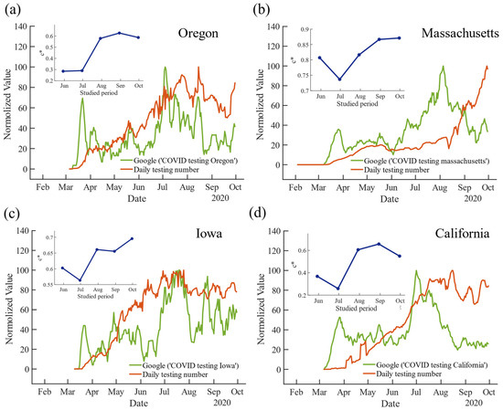 Google Trends index using the keyword ‘COVID testing’ (combined with a state’s full name) and daily testing number till 30 September 2020. The values of each curve are first smoothed by a 7-day-average to reduce the noise and are then normalized to [0, 100] for comparison. The inset in each chart lists the value of the highest correlation strength vs. the studied period for the COVID-19 daily testing number and the Google index using ‘COVID testing + state’.