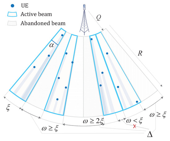 We consider a cellular deployment of mmWave NR BS as shown in Figure 1. The coverage area of each BS is approximated by a circularly-shaped area of radius R estimated using the mmWave propagation model and the set of MCS [14]. Each site is associated with three antennas each covering the sector with the angle of . The height of mmWave NR BS is fixed and set to . The operational frequency is . Each mmWave NR BS antenna is assumed to operate over B resource blocks. Recall, that the bandwidth of the resource block is affected by the utilized NR numerology. In our study, we use numerology 3.