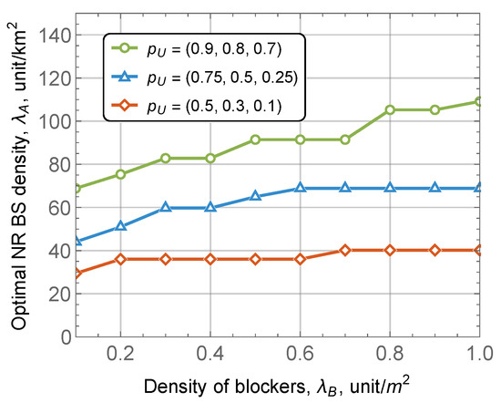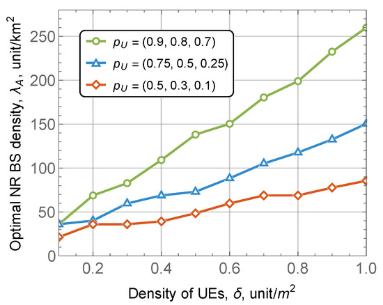By analyzing the data presented in Figure 4 one may observe that the scheme with is logically characterized with the least required NR BS density. On top of this, this QoS profile is also associated with the lowest increase in terms of the required NR BS density. Particularly, for the density of approximately UE/m2 and UE/m2 the associated NR BS densities are just 25 BS/km2 and 90 BS/km2, respectively. The latter values are as large as 150 and 250 for and QoS profiles, respectively. Also, logically, the stricter the QoS profile the higher the required BS density. The latter trend holds for all considered ranges of UE densities.