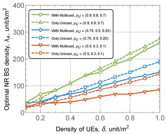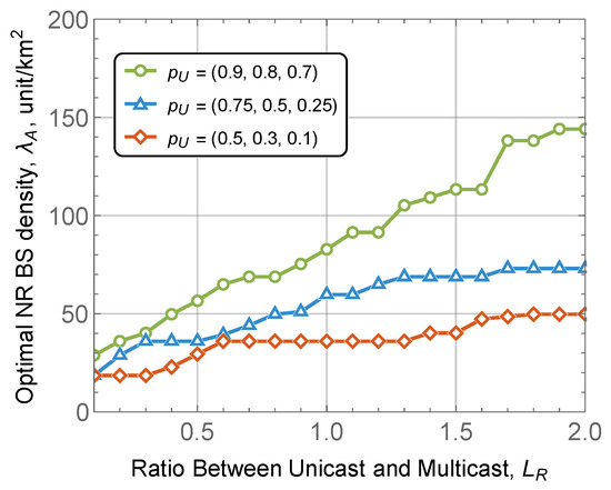 Analyzing the results presented in Figure 6 one may observe that the density of NR BSs logically increases with the increase the ratio of unicast to multicast traffic, , required to provision the service. Here, the gap between different QoS profiles also increases with the increase in coefficient. The rationale is that user-specific unicast sessions enhancing quality for users start to take occupy a significant share of resources.