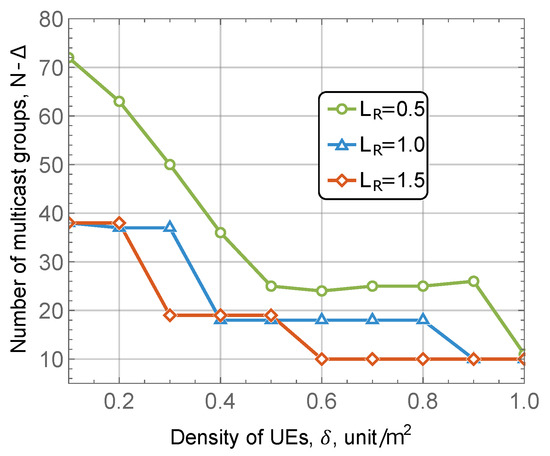 Note that the ratio between unicast and multicast traffic also affects the choice of the groups utilized for service provisioning. This trend is shown in Figure 7 as a function of UE density for blockers density set to bl./m2. Here, one may observe that there is significant difference between very strict QoS profile and milder ones, and . Note that the gap is highest for smaller values of UE density reaching 30–40 groups and decreases and UE densities grow. The rationale is that for high UE density the whole sectors served by NR NB antenna need to be covered. For sparse UE deployment, this is not the case leading to the noticeable difference in the number of utilized groups.