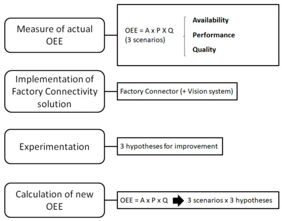 As a general overview, the steps involved in the research are shown in Figure 1. Firstly, the Overall Equipment Effectiveness (OEE) indicator in the machine considered in the experimentation has been measured before deploying the solution. Then, the Factory Connectivity solution has been implemented and tested. Finally, once the solution has been deployed, the new OEE value has been calculated.