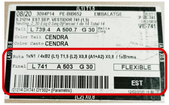 In addition to QR codes and barcodes, a significant improvement for the identification of pieces is the use of smart labels containing embedded modules to enable communication via wireless and integration with sensors [5]. Thus, the practical experimentation covered in this paper considers the factory as a single production unit. The retrieval of piece information from an ERP system is enough to obtain the status of the piece and its track, providing full traceability throughout the factory. Furthermore, for several reasons, barcode technology is adopted instead of Radio Frequency IDentification (RFID). RFID is a wireless communication technology that allows capturing data that may be linked to identification attributes (i.e., serial number, position, color, date) of items carrying labels. Its use is increasing, and its performance is being refined [6]. However, in the production environment, which is the focus of this experiment, the use of barcodes is preferred as the RFID technology may present problems with the metal rollers of the edge-banding machine. The shift of the resonance frequency and the use of metallic objects in RFID applications often degrade the efficiency and readable range of the tag antennas. To overcome these problems, researchers have proposed different approaches [7]. However, many of the standard solutions currently available do not guarantee compatibility with this type of environment. Furthermore, the resistance and durability of the barcode labels are higher than the RFID, and its deployment, considering that this is the current implementation in the selected factory, is less costly.