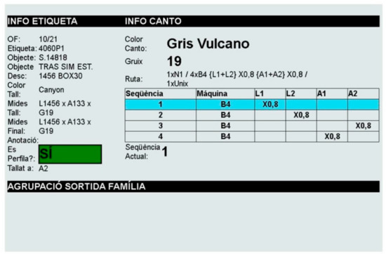 As shown in Figure 9, the Ruta (route) parameter reveals that the actual piece requires 1 operation in machine N1 and 4 operations in machine B4, while the X0,8 expression indicates the kind of edge to be applied to the piece. The texts in the interface are shown in Valencian language so the parameters are retrieved from the ERP of the company. The table of Seqüencia (Sequence) prompted in the dashboard allows the workers to redirect each piece to the appropriate repository in a more reliable and agile way, providing a full traceability of each piece throughout the plant.