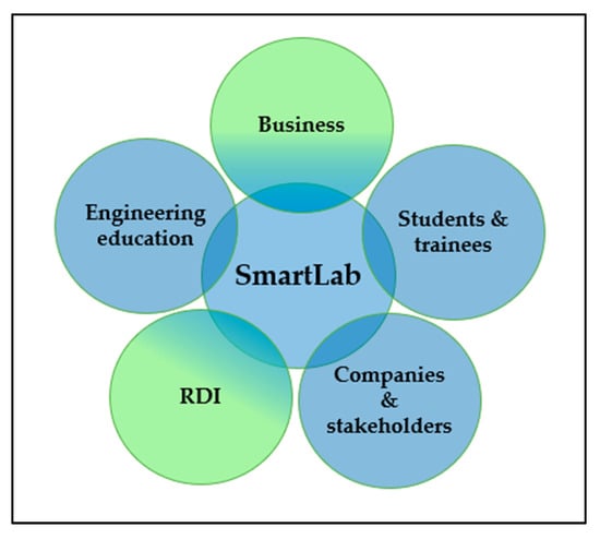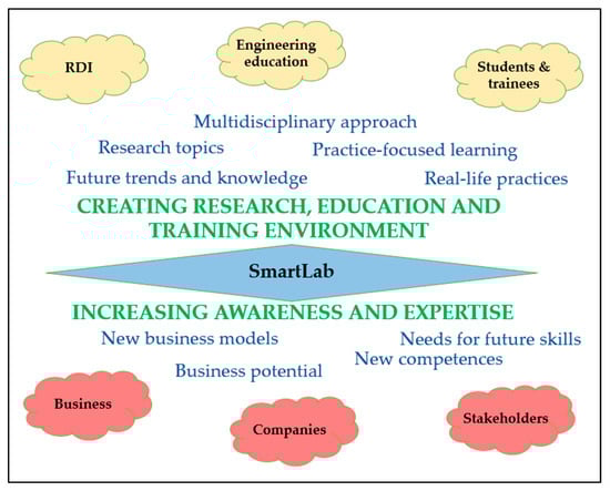 The planning of SmartLab and its framework was based on the needs of several key stakeholders. The primary focus was the development of engineering education in relation to the surrounding industries, companies, and various stakeholders involved. Students and trainees need to develop their skills in relevant and up-to-date learning environments that are valued and needed by different industries in our region and changing new business models [14]. RDI operations can also be perceived as a vessel for knowledge transfer, from research organizations to practice and ultimately to companies. Figure 1 illustrates these main actors of the SmartLab concept.