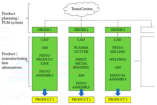 As Figure 3 illustrates, the SmartLab concept consists of two parts, the design and the manufacturing phase; hence, the principle, from idea to product. The need or product idea is developed in the design phase, in which the Lapland UAS mechanical engineering students perform engineering design work to produce the necessary product data (e.g., CAD files and documents such as instructions, etc.). These assignments can either be learning projects or even assignments from the partners of outside customers. The output is the product data that is uploaded to the product data management system (PDM), enabling the control of the data (e.g., distribution and version control). The PDM system is part of a larger digital product lifecycle management system (PLM) called Teamcenter software [46]. Teamcenter connects the product lifecycle with the SmartLab processes by providing an interface for controlling product development, manufacturing, and quality, to mention only a few [46]. The manufacturing part consists of digital and traditional manufacturing systems and AM. Digital manufacturing consists of a Festo Cyber-Physical (CP) Lab environment [47] with automated modules such as turning, milling, robotics, camera inspection, pick-by-light assembly, the pressing station, and storage. The system is a compact learning system where the I4.0 principles can be practiced with different learning scenarios. The product or part is transferred between the modules on top of a pallet via conveyor belts. The system uses radio frequency identification (RFID) to recognize the pallet in the different stages of the process. The system enables the assembly of a product via a manual pick-by-light assembly station. The system can be expanded with different application modules [48]. Conventional manufacturing consists of welding with multiple methods, an NC plasma cutter, an NC controlled sheet metal bending machine, and other tools and equipment for manual manufacturing and finishing. The AM department consists of polymer printing technologies, enabling the direct manufacturing of products and prototypes. In addition, AM provides parts for the products manufactured and assembled in the digital/traditional manufacturing departments. This enables hybrid products in which all these three manufacturing alternatives meet. Digital and traditional manufacturing are monitored through data (e.g., production data such as lead time, efficiency, and energy consumption). The whole is controlled and monitored through the Teamcenter interface, enabling enterprise resource planning (ERP) activities. From the education perspective, the whole provides novel scenarios for learning modern manufacturing.