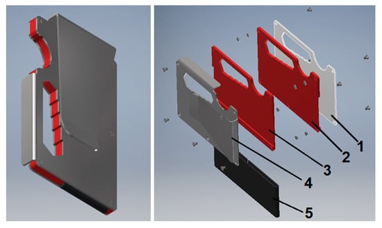 As Figure 5 shows, the credit card casing assembly consists of five separate parts. The basic idea is that the assembly works with a rubber band, allowing the insertion of cards inside the casing. A form for different standard sizes of hexagonal holes was implemented, allowing the use of the product as a “wrench”. This was also a design aspect that emphasized the mechanical engineering trade at the same time. The product includes a bent holder for bills. The bent holder/flap can also be used to attach the casing to a belt. In Figure 5, part one (1) is manufactured from a stainless steel sheet with an NC controlled plasma cutter (traditional manufacturing). Parts two (2) and three (3) are 3D printed from PLA. Part four (4) is manufactured from the stainless steel sheet, cut with an NC controlled plasma cutter, and bent with an NC controlled sheet metal bending machine. Part five (5) is made from a rubber presenting material, which is the standard material bought outside the project. The assembly is done on the digital Festo manufacturing line, where the parts are processed, buffer stored, and finally manually put together in the manual assembly station of the Festo line with small screws. The processing of the assembly requires the programming of the Festo line through the manufacturing execution system (MES4) system. MES4 is a database-founded system that enables process planning, the programming of workflows and work orders, and the presentation of information from costs, lead time, and, e.g., power consumption [37]. In the manufacturing of the credit card casing, the Festo system allows the order, identification, mid-storage, and handling of the parts in assembly.