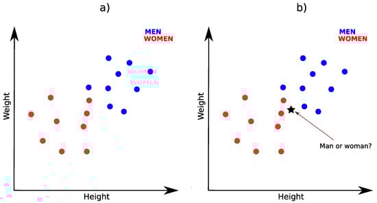 Data about the height and the weight of men and women were gathered and are presented in Figure 1a. The blue points represent data that were labeled as men and the red as women. Then, suppose that we add a new individual to the dataset. We are told that this new individual is a man; however, we only introduce their height and weight to the algorithm to see if it is capable of classifying them correctly. This is shown in Figure 1b, where the new individual is represented as a star.