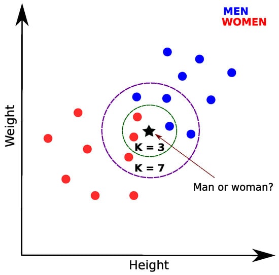 In Figure 2, the new observation is being classified by its K nearest neighbors, where K has two different values: and . For , the closest neighbors are the ones inside the green circle, and for , the closest neighbors are inside the purple circle. It can be seen that, if , two of those three neighbors are women, so the new observation would be classified as a woman. However, if , most of the closest neighbors are men, and then the new individual would be classified as a man. So, for the classification of this new individual, is better than because it classified it as a man, which was its real gender. Nevertheless, this does not mean that is the best overall value for the dataset; more new observations must be classified with different K values to find the value with the best performance.