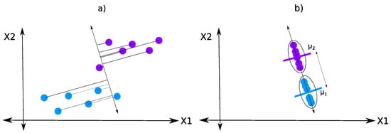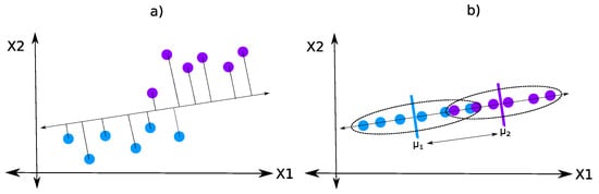 where represents the means of projections of classes 1 and 2 (), are the means of classes 1 and 2, and represents the variance (), letting be the projected samples . Using these equalities, Fisher’s criterion can be written as a function of w as: