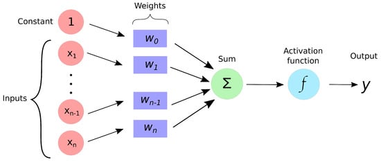 In Figure 7, it can be seen that one constant input is related to weight . This weight is the bias () of the system and represents the threshold that must be surpassed to fire the activation function. The system shown in Figure 7 can be mathematically represented as follows: