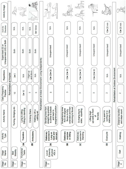 The rehabilitation process involves three phases, i.e., supervised rehabilitation at the hospital; unsupervised/guided rehabilitation at home; and unsupervised rehabilitation outdoors. These three phases are spread across four different stages: stages 1 and 2 constitute the first rehabilitation phase which aims to improve a patient’s independence through bed mobility and a range of functional motion exercises. These exercises allow the patients to be safe ambulators within their home environment. Stage 3 refers to the second rehabilitation phase where an exercise program is provided to a patient by a hospital-based physiotherapist. The prime focus here is to improve lower extremity physical ADLs, particularly ambulation. The activity movements involve aids to increase joints’ range of motion and muscle strength. Stage 4 is the last stage of the rehabilitation phase which allows patients to ambulate outside the home environment. This phase helps to boost their confidence, improve their mental health, and re-integrate within their local community.
