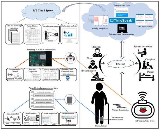 Drastic transformation has taken place with the integration of the IoT into healthcare due to the integration of heterogenous types of physical hardware and software and using them to collect data, perform analyses, and facilitate services and various user interactions with the targeted process. Moreover, it can significantly reduce the cost, enrich a user’s interaction experience, and boost their quality of life. Findings show that wearables based on IoT technology can bring about endless opportunities, especially for healthcare monitoring applications [10,11,12,13,14,15]. The authors of [10,11,12] also indicate that wearables based on IoT technology would be realized when an integrated IoT system is available that has all of the needed functionalities distributed at various levels. Despite all the progress in IoT-based healthcare systems and the potential to create an upsurge in different healthcare applications, there is limited focus on offering a wearable solution for the post-operative hip fracture rehabilitation process. This paper is part of a progressive attempt to address the organization and functionalities of an IoT-based rehabilitation model that supports post-operative hip fracture patients in their rehabilitation process.