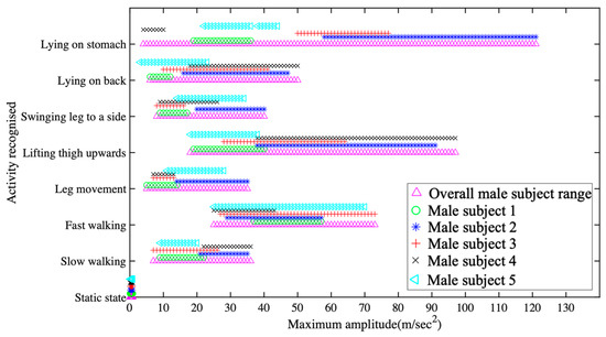 Personalized activity recognition comparison of five male subjects vs. overall subject range with respect to maximum amplitude.