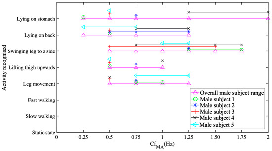On the other hand, if we take the CfMA parameter (as can be seen Figure 4) into consideration, the overall subject range similarly has a high degree of overlap with almost all activities—whereas for each individual subject range, some activities overlap partially and others with a high degree. For instance, in the case of the activities of male subject 2, LM, LTU, LOB and LOS overlap with each other to a high degree, but their amplitudes vary, which that makes it easier to classify such types of activities. On the other hand, for male subject 1, only the LTU activity overlaps with LOB.