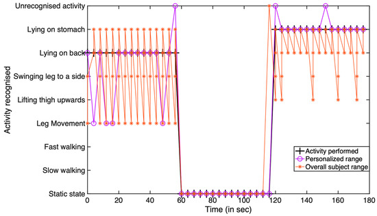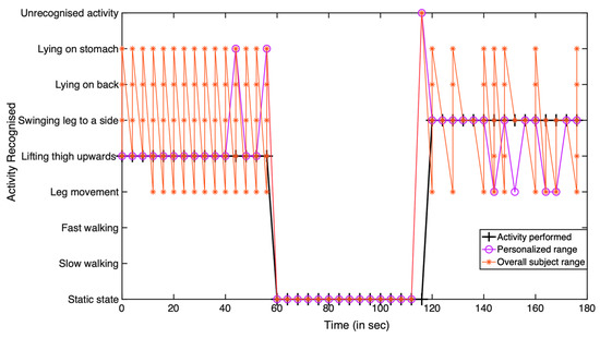 To investigate the significance of personalization over the overall subject range in recognizing a particular activity, the subject was instructed to perform a long-term group-based activity for a period of 3 min (where each activity is conducted for a period of 1 min) and analyzed considering the different scenarios. A sample example of such scenario is illustrated while considering two cases. These are as follows: