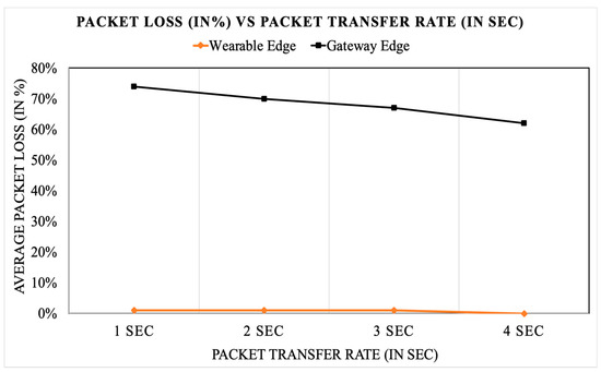 Average packet loss when acquired data are processed and compressed at the wearable edge or gateway edge for an active five-node network. Processing at the wearable sensor age offers significant improvement in terms of system performance.