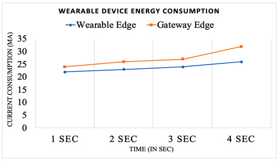 Considering the radio packet transmission and computational processing occurring at the wearable and gateway edge levels, analyzing the wearable device energy consumption and how long it would last at four different time intervals chosen in the packet loss analysis is essential. Since the Microduino modules can run on 3.3 V, the wearable device is powered with a ½ AA rechargeable battery of 1000 mAh at 3.7 V with a cut-off voltage of 2.75 V. The battery selection is random in order to cover a day. Figure 9 represents the wearable and gateway edge energy consumption at four different time intervals, i.e., 1, 2, 3, and 4 s. The results show that at the wearable edge level, the current consumption for all time intervals ranges from 20 to 24 mA. However, at the gateway edge level, it ranges from 25 to 30 mA. Therefore, the gateway edge current consumption is higher compared to the wearable edge because 128 communication transactions with a data packet size of 12 bytes are continually transmitted.