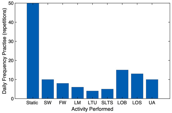 In support of the sample representation, an overall summary representation of the daily frequency practice of the activity performed by a subject during the day is presented in Figure 11. The numbers related to daily frequency practice refers to the number of each repetition performed every 4 s by a patient for a particular activity. For instance, the patient was doing slow walking activity 10 times of 4 s recognition.
