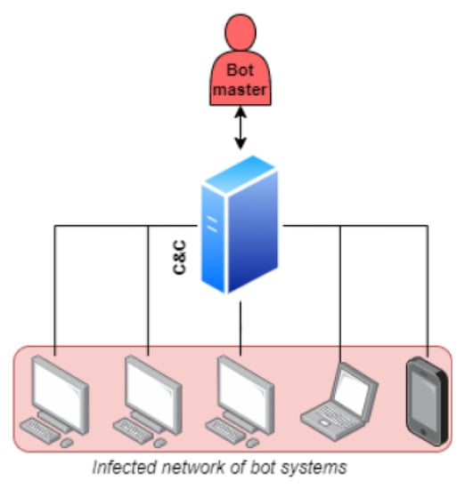 A botnet is a network of malware-infected hosts, which are typically controlled by a Command and Control (C&C) server. The C&C server architecture allows for distributed malicious attacks on either the infected hosts or other interconnected hosts over LAN or the internet [5,6]. C&C servers are commonly known as the botmasters, while infected hosts are simply referred to as bots [1].