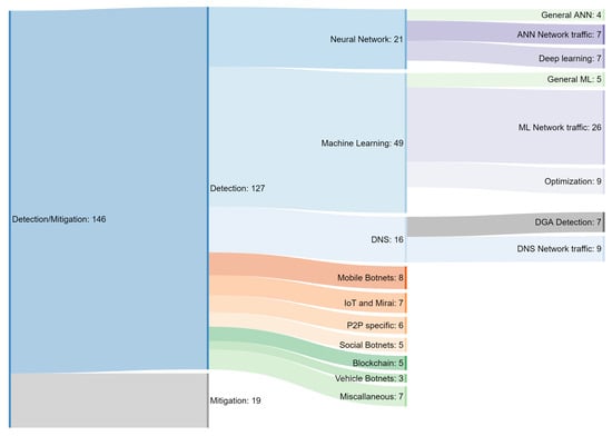 Some earlier papers such as [10] discuss the threats botnets pose to the general information security landscape. The paper looks into how law enforcement can act upon the criminals behind botnets and focuses mostly on botnets from the perspective of information security. Reference [10] does not, however, go into specific detection or mitigitation mechanisms. Reference [22] touches upon and analyses the use of honeynets, honeypots, signature-based detection with IDS, anomaly-based detection with network analysers such as Botsniffer, mining-based detection and DNS-based detection. Furthermore, the survey explores the use of abnormally recurring NXDOMAIN reply rates as a method of detection. The survey is quite limited in scope; for instance, the paper only presents 13 different papers within botnet detection approaches while this paper has more than 100. Reference [23] proposes detection, prevention, investigation and mitigation techniques by classifying the evolved strategies into five categories: anomaly, signature, DNS, data mining and hybrid technique. Again, the paper is limited in scope with only 39 different detection papers mentioned. Reference [25] addresses four different major botnet detection approaches: signature-based, anomaly-based, DNS-based and mining based detection but does so with four pages and only seen papers mentioned. Reference [30] focuses primarily on botnets used in DDoS attacks. The paper goes into depth about the life cycle, communication mechanisms and attack types within DDoS-enabled botnets. The paper does not discuss any mitigation mechanisms, however. Reference [31] is another survey with a specific focus, namely IoT botnets, which gives a very good introduction to the specific topic of IoT botnets, but otherwise does not cover any other kinds of botnets. Reference [24] endorses convolutional neural network (CNN) as being one of the best-performing techniques for detecting botnets in IoT devices. While a newer systematic review [32] answers the questions of how IoT botnets are formed, what kind of communication and scenarios involve IoT botnets, and which methods currently exist to detect IoT botnets.