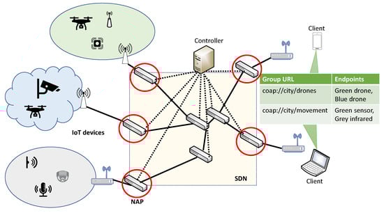CoAP group communication is a CoAP extension that allows CoAP clients to retrieve (or set) resources from a group of CoAP servers, e.g., retrieve the temperature measurements from all sensors of a building, turn on and off all the lights of a smart city, etc. An approach for realizing CoAP group communication is using IP multicast (Section 2 of []). With this approach, CoAP servers belonging to the same group join an IP multicast address, and CoAP clients learn the IP multicast address of a group using DNS resolution. Then, CoAP clients can send CoAP requests to an IP multicast address and receive the corresponding response(s) using unicast. Nevertheless IP multicast is not the only option; other underlay networking architectures can be used instead. For example, as as we discuss in the following section, our solution relies on SDN to implement one-to-many communication.